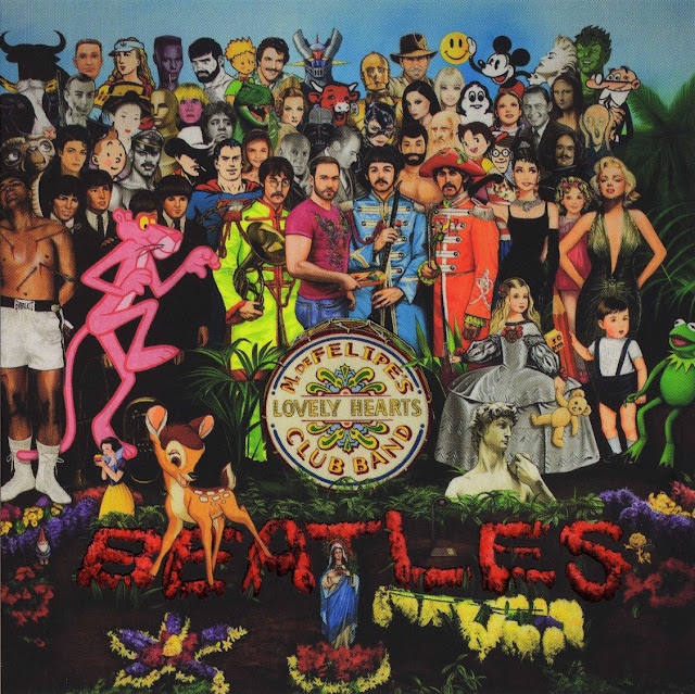 "Sergeant Peppers 's lonely hearts club band " revisited l'artiste s'y est representé au milieu en lieu et place d'un Beatle originel ,on retrouve sur cette pochette détournée une multitude de personnages de la Panthere rose a Kermit , de Freddie Mercury a Tintin